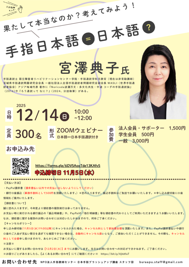 2025年度第4回日本手話ブラッシュアップ講座は、特別講演会を行います。国立障害者リハビリテーションセンター学院で長らくご指導されていた宮澤典子氏をお迎えし、「果たして本当なのか?考えてみよう!手指日本語=日本語?」というテーマでお話をうかがいます。