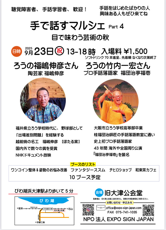 4回目の開催になります。今回は福井県より陶芸家であり、ろう者福嶋伸彦さんの講演会とプロ落語家の竹内一宏さんをゲストとして、お招きします。