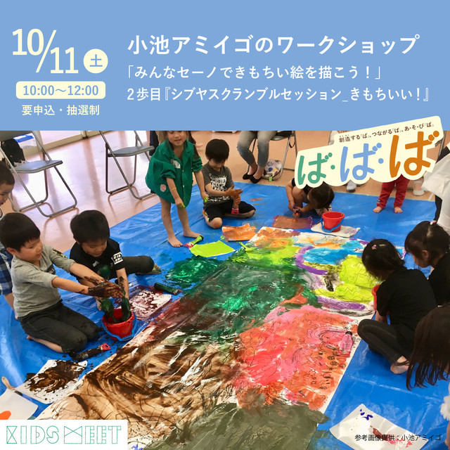 子どもたちの表現の最初の一歩が幸せなものであることを願い、 小池アミイゴ さんが日本各地で開催してきたアートセッション、小池アミイゴのだれでも絵が描けるワークショップ「みんなセーノできもちい絵を描こう!」。今回は東京都渋谷公園通りギャラリーを舞台に、街に向かって開かれた場所だからこそのワークショップ3DAYsを、「きもちい!」を合言葉に行います。