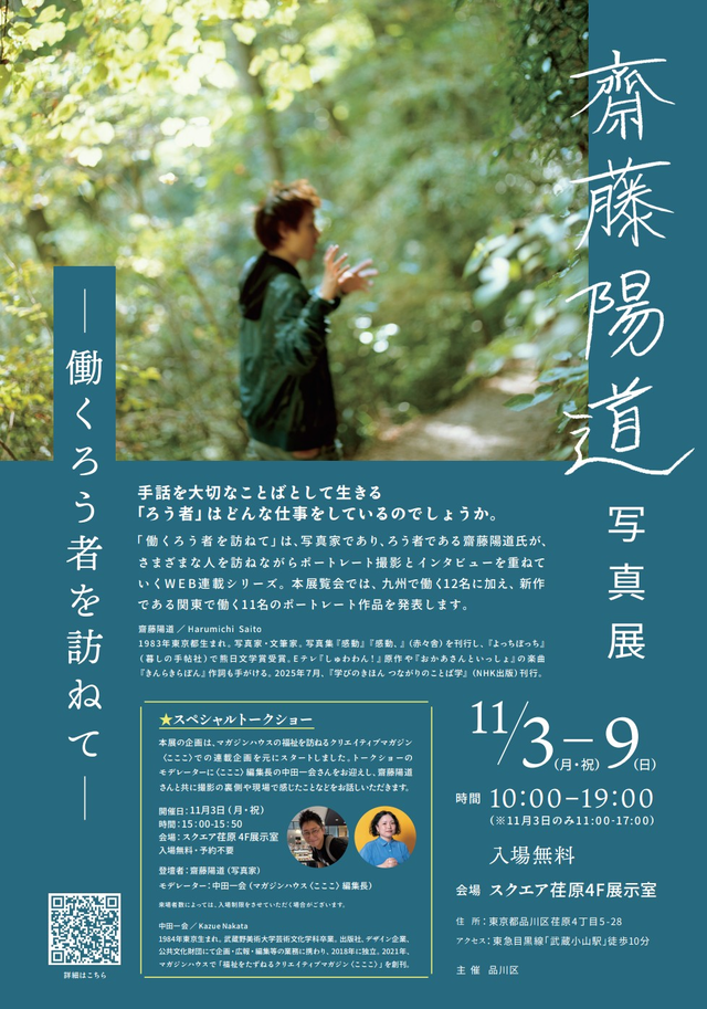 「働くろう者を訪ねて」は、写真家であり、ろう者である齋藤陽道がさまざまな人を訪ねながらポートレート撮影とインタビューを重ねていくWEB連載シリーズです。本写真展では、九州で働く12人の作品に加え、関東で働く11人のポートレート作品を展示します。