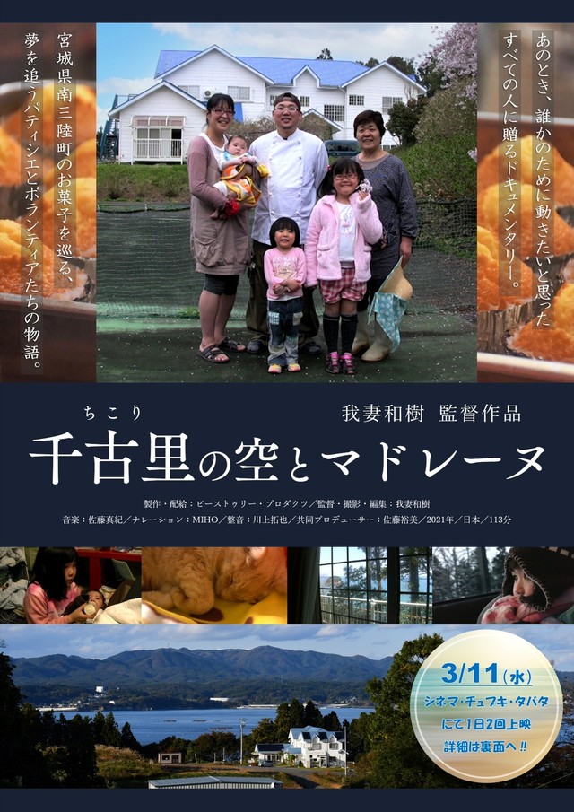 宮城県南三陸町を舞台にした長編ドキュメンタリー映画『千古里の空とマドレーヌ』(2021年/113分)が、3月11日(水)にシネマ・チュプキ・タバタさんで1日2回上映されます。 『千古里の空とマドレーヌ』は、被災から前に進めなかったパティシエの男性が、ボランティアの協力を得て再びお菓子作りを始める過程を追った映画です。支援を受ける側の葛藤はもちろん、支援をする側の葛藤も描いており、災害ボランティアをテーマにした数少ない作品になっています。